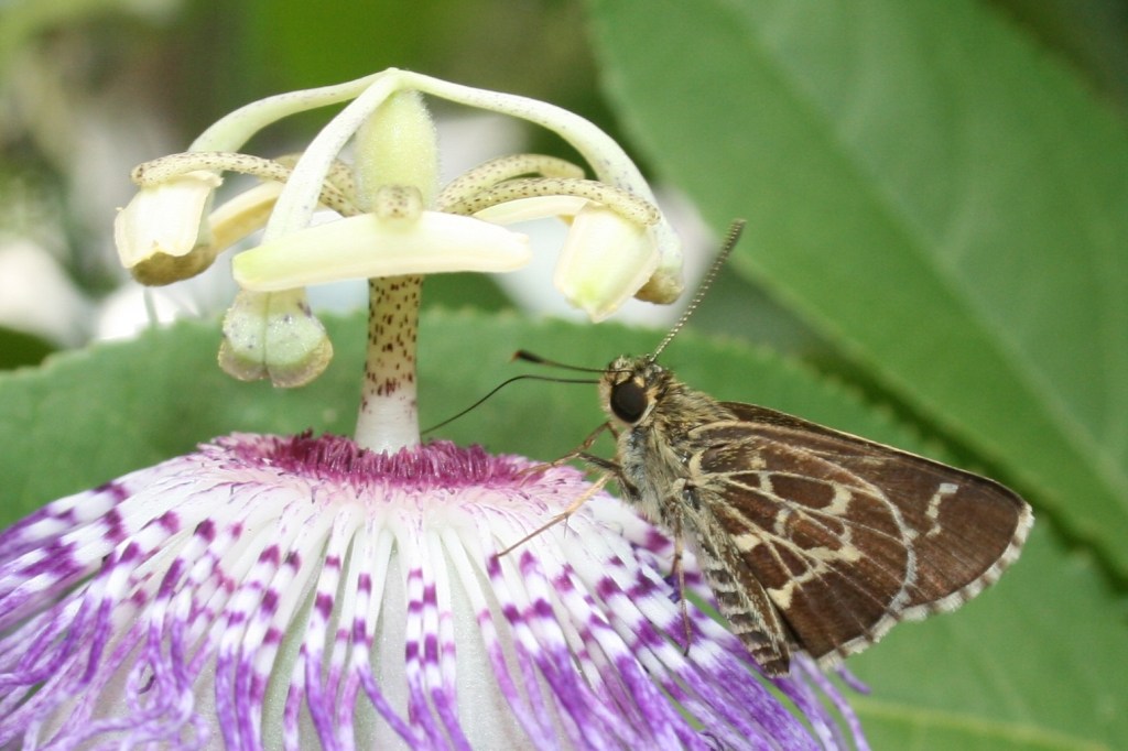 Passionflower vine is the only host plant for gulf fritillary butterflies, but the nectar from its flowers can be used by other butterflies, like this skipper. It functions as both a nectar and a host plant.